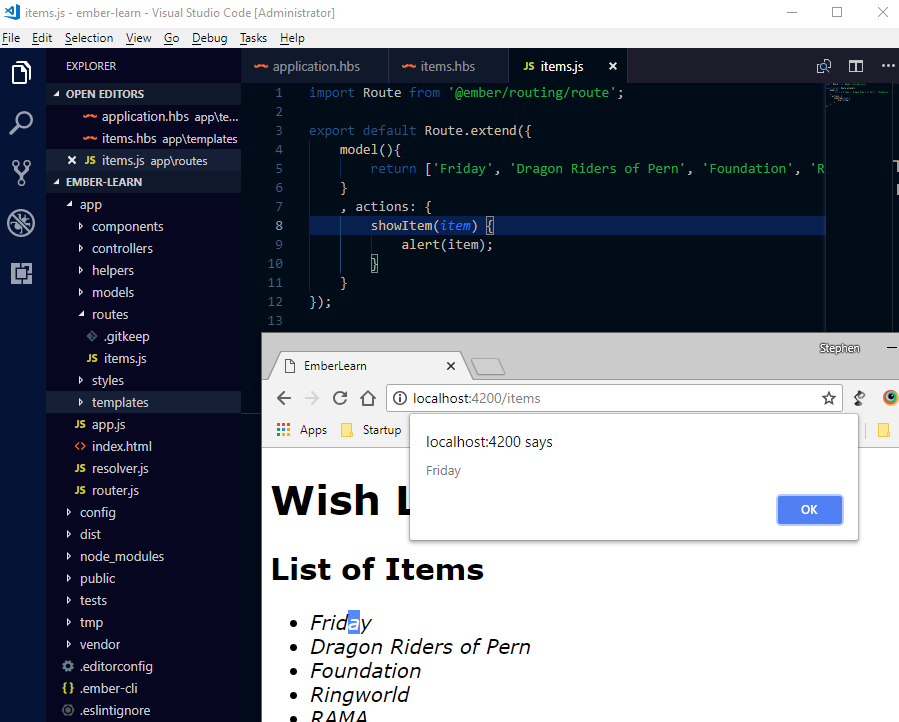 This is my continuing efforts to work with the Ember JS (www.emberjs.org) Framework. The expectation is to build a simple wish list of items. Part one started the Ember application, part two started our first route and today we're actually going to have the application do something by having it respond to a mouse click.